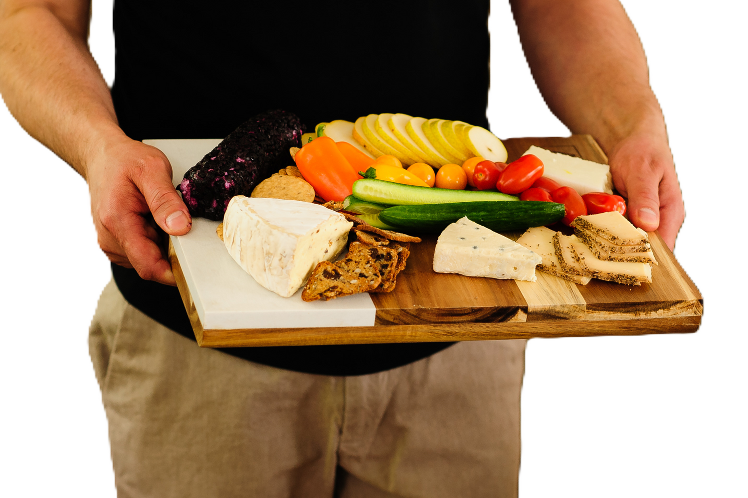 We have these boards that have the best cheese knives we offer. The wood is deliciously gorgeous with a section of marble to hold your cheeses or meats. The marble maintains it's temperature. It is a not to the heritage of stone cheese boards from traditional European boards.