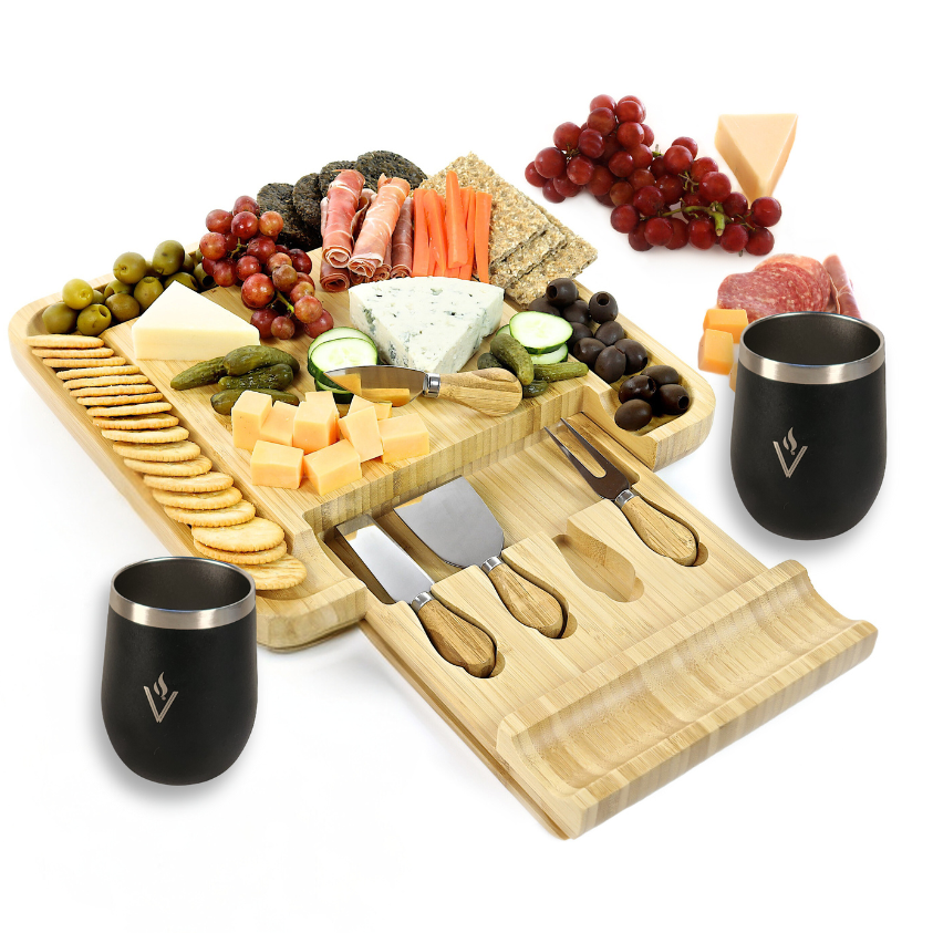 A complete set of charcuterie board, knives, and tumblers. Use them on the patio, on a picnic, or any occasion where you want a charcuterie and drinks. The tumblers are vacuum insulated and perfect for hot or cold drinks. Similar to a stemmed wine glass, they don't let your hands affect the temperature of the wine. Plus they are pretty indestructible.