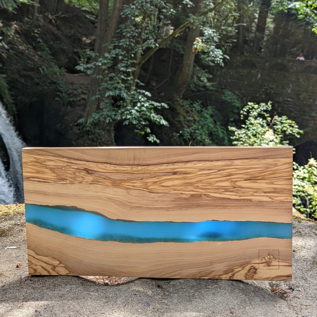 With its long, narrow rectangular shape and wavy wood grain detailing running the length of the board, this large olive charcuterie board is sure to make an impression. The food-safe resin inlay that runs along the wood is inspired by moving water.