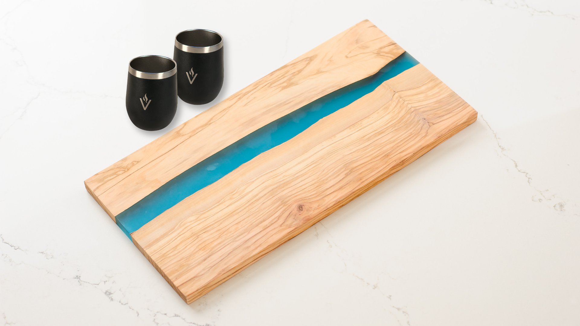 Crafted from olive wood and deep blue resin, this charcuterie board is inspired by nature to create a one-of-a-kind tabletop display. Add a couple tumblers for a great gift set or perfect for outdoor settings.