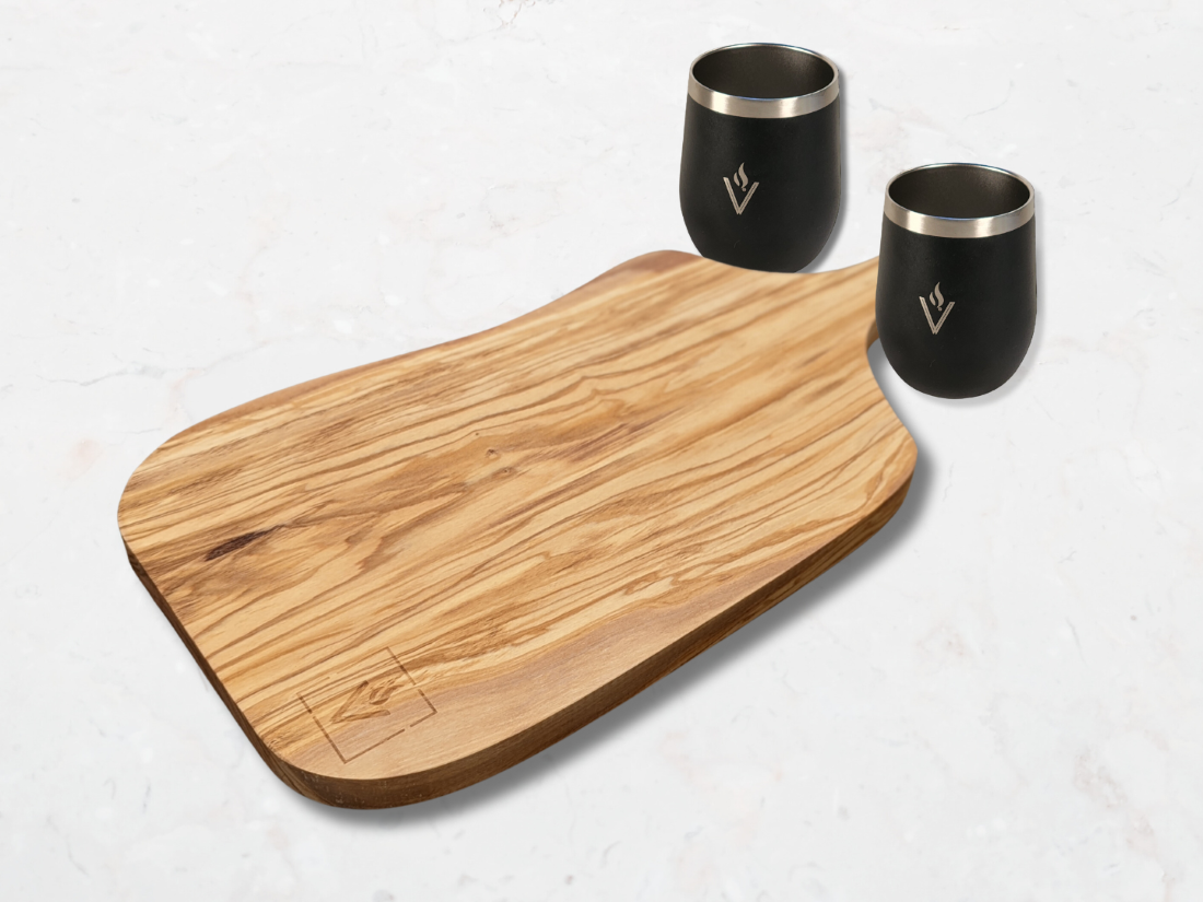 Our gorgeous olive wood charcuterie board with handle and a couple tumblers make a great combination. Combine and save 20%.