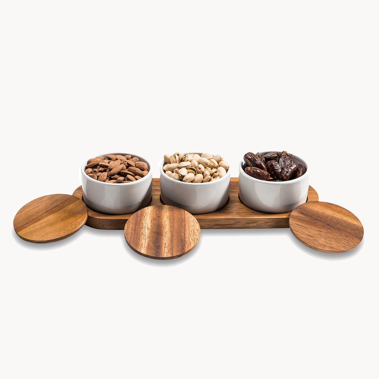 Round White Condiment Bowls With Lids and Acacia Wood Serving Tray | Ceramic Set